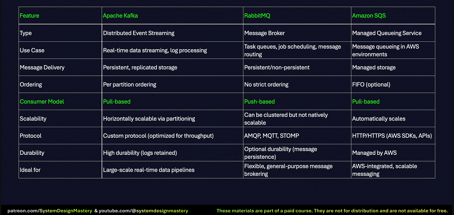Kafka vs. RabbitMQ vs. SQS: A Comprehensive Comparison for Distributed Messaging ( Pull vs Push )Apache Kafka, RabbitMQ, and Amazon SQS are three of the most popular options, each with unique strengths tailored to different use cases.System Design MasterySep 21, 2024∙ PaidShareApache Kafka: Distributed Event StreamingApache Kafka is a distributed event streaming platform designed for real-time data ingestion and processing. It's particularly well-suited for high-throughput…This post is for paid subscribersSubscribeAlready a paid subscriber? Sign in